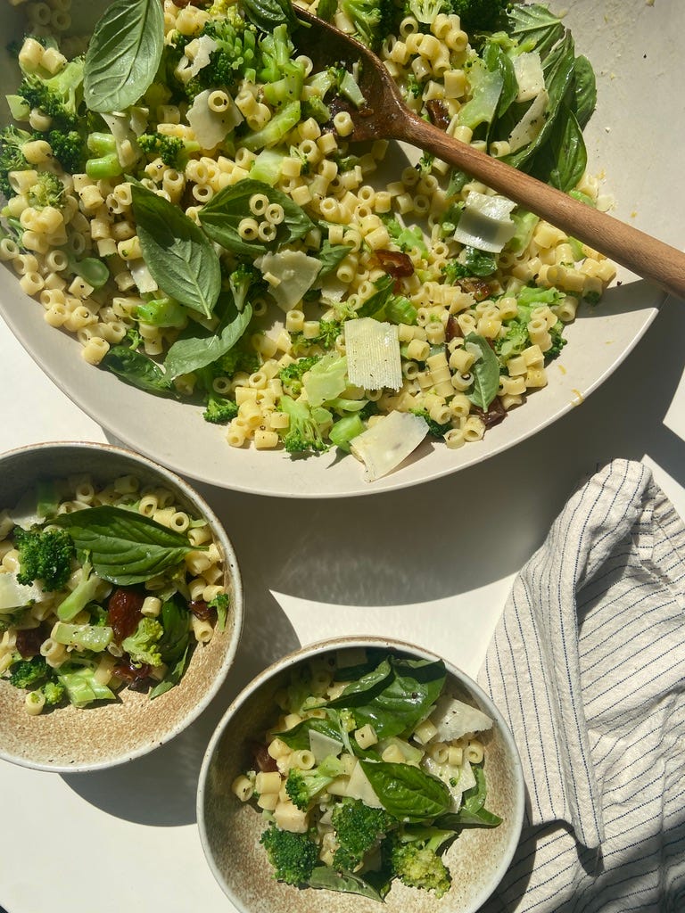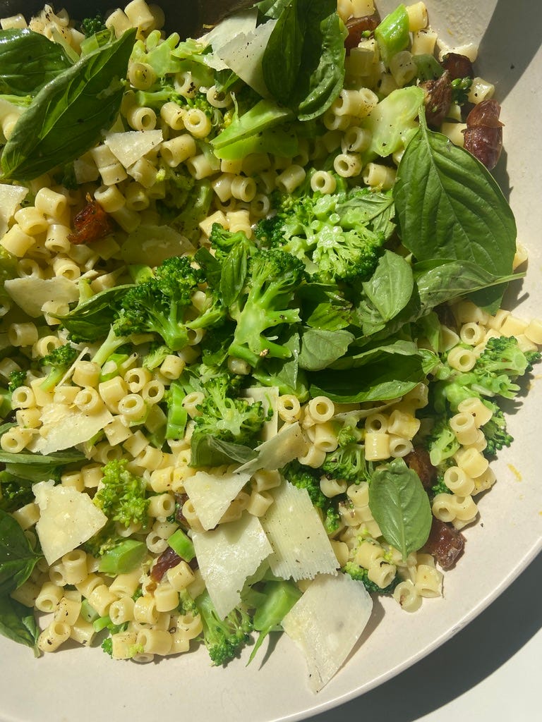 There’s an ease to this salad, the sort you might throw together right about now, when the basil is still fragrant and delicate but the to-do list is…substantial. The spoon-sized pasta carries a fruity slick of Sherry vinegar and olive oil. There’s the caramel softness of dates, the prick of shallot, and the salty edge of shaved Parmesan. The broccoli, as much of it as pasta, boils for just a beat, to maintain some of its bite and brightness. This is food that forgives: let it lounge on the counter, eat it cold from the fridge, or spoon it up in a rush.